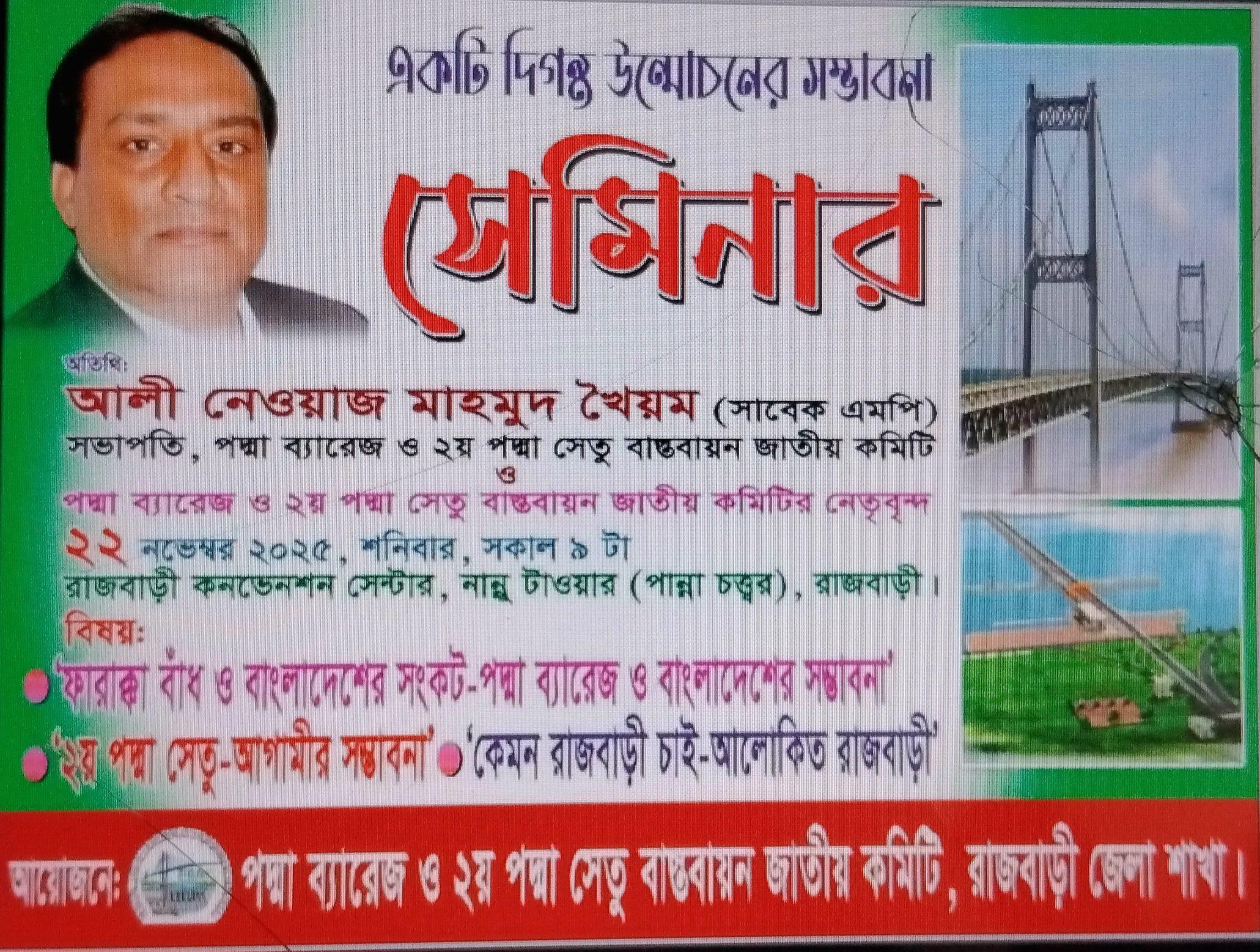 বিশেষ প্রতিনিধি পদ্মা ব্রিজ ও দ্বিতীয় পদ্মা সেতু বাস্তবায়ন জাতীয় কমিটি রাজবাড়ী জেলা শাখার উদ্যোগে আগামী ২২ নভেম্বর ২০২৫ তারিখে রাজবাড়ী কনভেনশন সেন্টারের এক সেমিনারের আয়োজন করা হয়েছে। অনুষ্ঠানে সভাপতিত্ব করবেন পদ্মা ব্যারেজ ও ২য় পদ্মা ব্রিজ বাস্তবায়ন জাতীয় কমিটি রাজবাড়ী জেলা শাখার সভাপতি সালাম তাসির ,ফারাক্কা বাঁধের কারণে রাজবাড়ী বিস্তারিত..