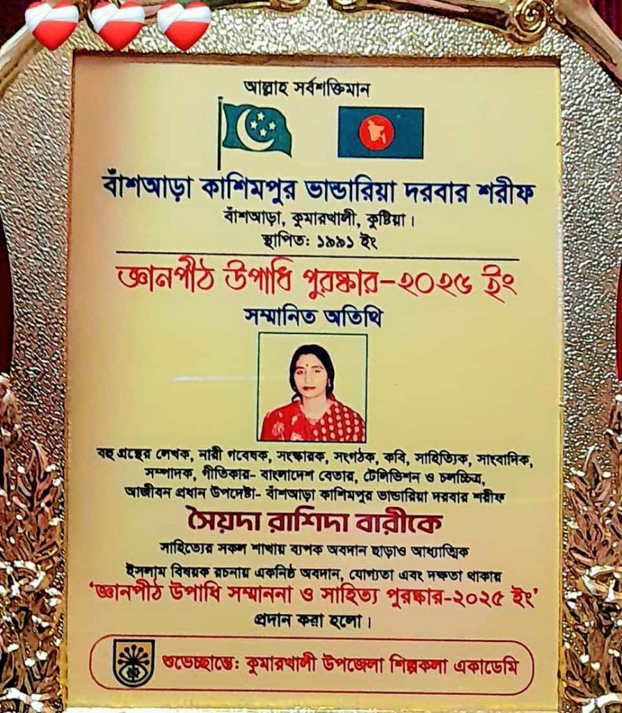কুষ্টিয়ার কুমারখালী বাঁশআড়া কাশিমপুর ভান্ডারিয়া দরবার শরীফের ৩দিনব্যাপী বাৎসরিক ওরশ অনুষ্ঠান অনুষ্ঠিত হয়। প্রতি বছরের ন্যায় এবছ গত ২৯ নভেম্বর শনিবার, উদ্বোধন করেন কুমারখালী শিল্পকলা একাডেমীর পরিবেশনায় আয়োজন এ অনুষ্ঠানের প্রধান অতিথি এস এম মিকাইল ইসলাম (উপজেলা নির্বাহী অফিসার- কুমারখালী, সভাপতি- কুমারখালী উপজেলা শিলপকলা একাডেমী)। উপস্থিত ছিলেন প্রধান আলোচক -কে এম আলম টমে (সাধারণ সম্পাদক- কুমারখালী উপজেলা শিল্পকলা একাডেমী)। সম্মানিত ও বিশেষ অতিথি হিসেবে উপস্থিত ছিলেন- খন্দকার লিপু আমির (বর্তমান সভাপতি কুমারখালী প্রেসক্লাব), মোঃ সোহাগ মাহমুদ (সাধারণ সম্পাদক-কুমারখালী প্রেসক্লাব), ডাঃ মোঃ আবুল হাশিম- চক্ষু বিশেষজ্ঞ ও সার্জন, প্রাক্তন বিভাগীয় প্রধান ও সহ- অধ্যাপক (ফরিদপুর ও বগুড়া মেডিকেল) বকুল চৌধুরী (প্রতিষ্ঠাতা সভাপতি- কুমারখালী প্রেসক্লাব), মিজানুর রহমান লাকি- সিনিয়র সাংবাদিক ও সংগঠক (কুষ্টিয়া), সৈয়দা রাশিদা বারী- (প্রতিষ্ঠাতা সহ-সভাপতি কুমারখালী প্রেসক্লাব), শুভ্রা বিশ্বাস (কবি ও সাংবাদিক), সৈয়দা তানিয়া সিমি (কবি ও লেখক) উক্ত এই অনুষ্ঠানে কথা সাহিত্যিক, সম্পাদক, সংগঠক কবি সৈয়দা রাশিদা বারীকে তার সাহিত্যের সকল শাখায় ব্যাপক অবদানের স্বীকৃতি স্বরূপ ‘জ্ঞানপীঠ উপাধি সম্মাননা ও সাহিত্য পুরষ্কার ২০২৫ইং’ প্রদান করা হয়। তিনি একজন কবি সাহিত্যিক সংগঠক সাংবাদিক সম্পাদক, এছাড়াও তিনি বাংলাদেশ বেতার টেলিভিশন ও চলচ্চিত্রের গীতিকার,ও ভান্ডারিয়া দরবার শরীফের আজীবন উপদেষ্টা, আজ ছিল অনুষ্ঠানের সমাপনী দিন।